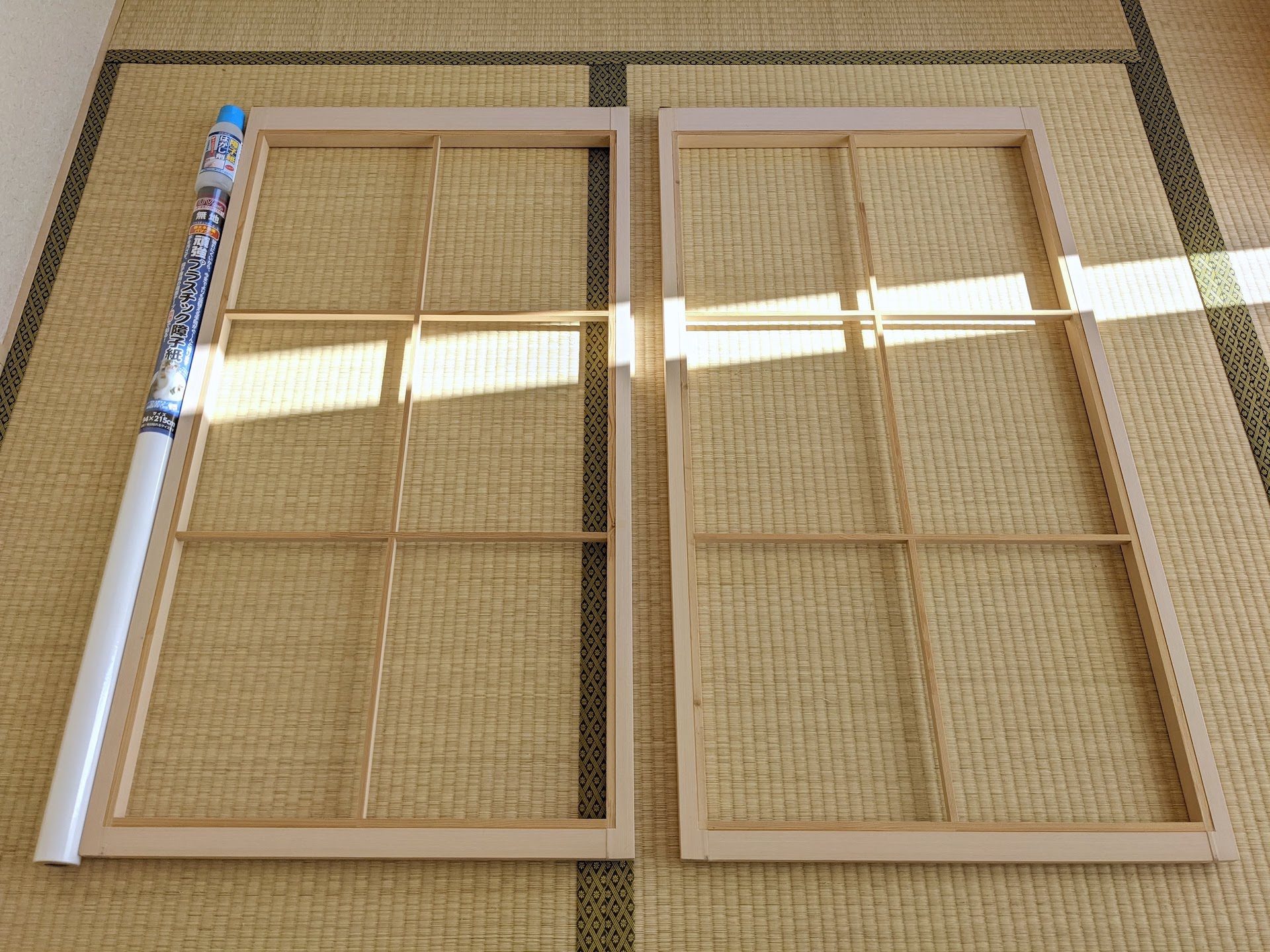 障子のサイズがだいたい 60 x 110cm なのに対して、障子紙は 94 x 215cm と少し足りない計算で、2枚目の障子は切り貼りする必要があるかと思っていたが、結果的になんとか収まった。表記サイズより余分に長く入っていたようで助かった。