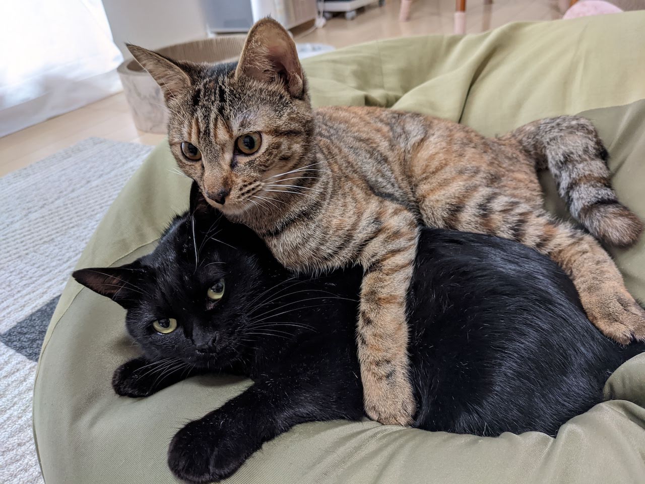 増えた。黒いのが前からいたほう。茶色いのが2月に来たほう。